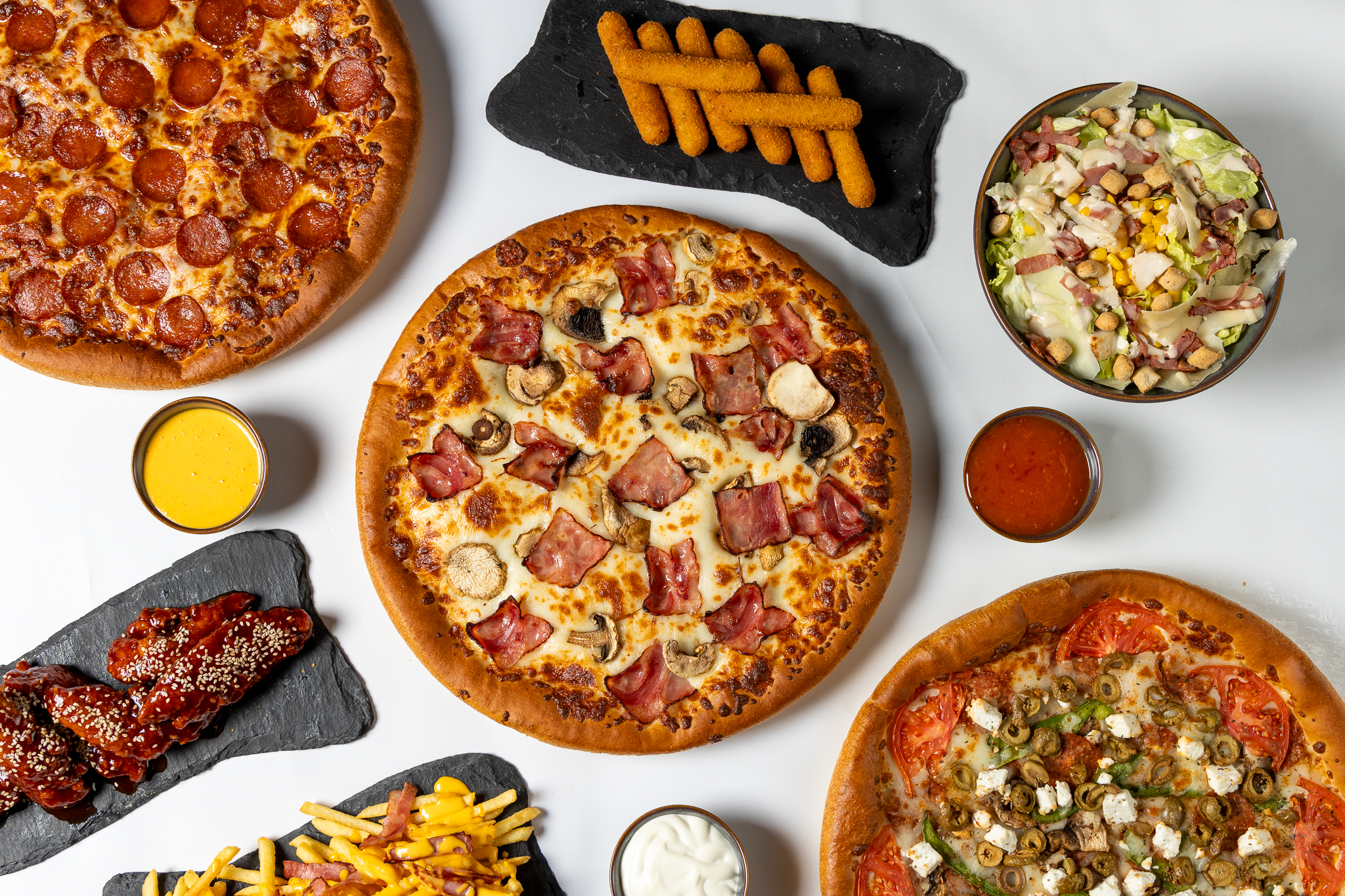 Signature burgers και pizzas στο μενού μας, έτοιμα να ικανοποιήσουν κάθε γευστική σας επιθυμία.